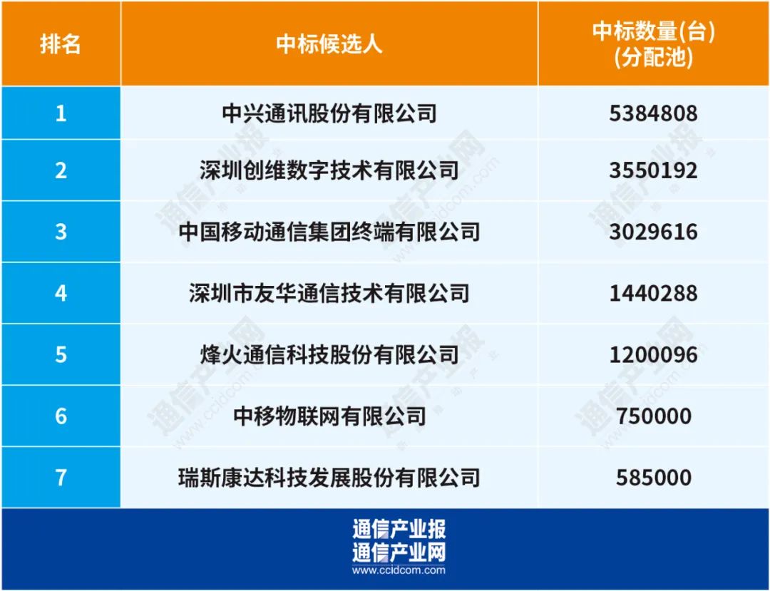 根据份额测算,中兴通讯中标5384808台,创维中标3550192台,中国移动终端公司中标3029616台,友华中标1440288台,烽火通信中标1200096台,中移物联中标750000台,瑞斯康达中标585000台。